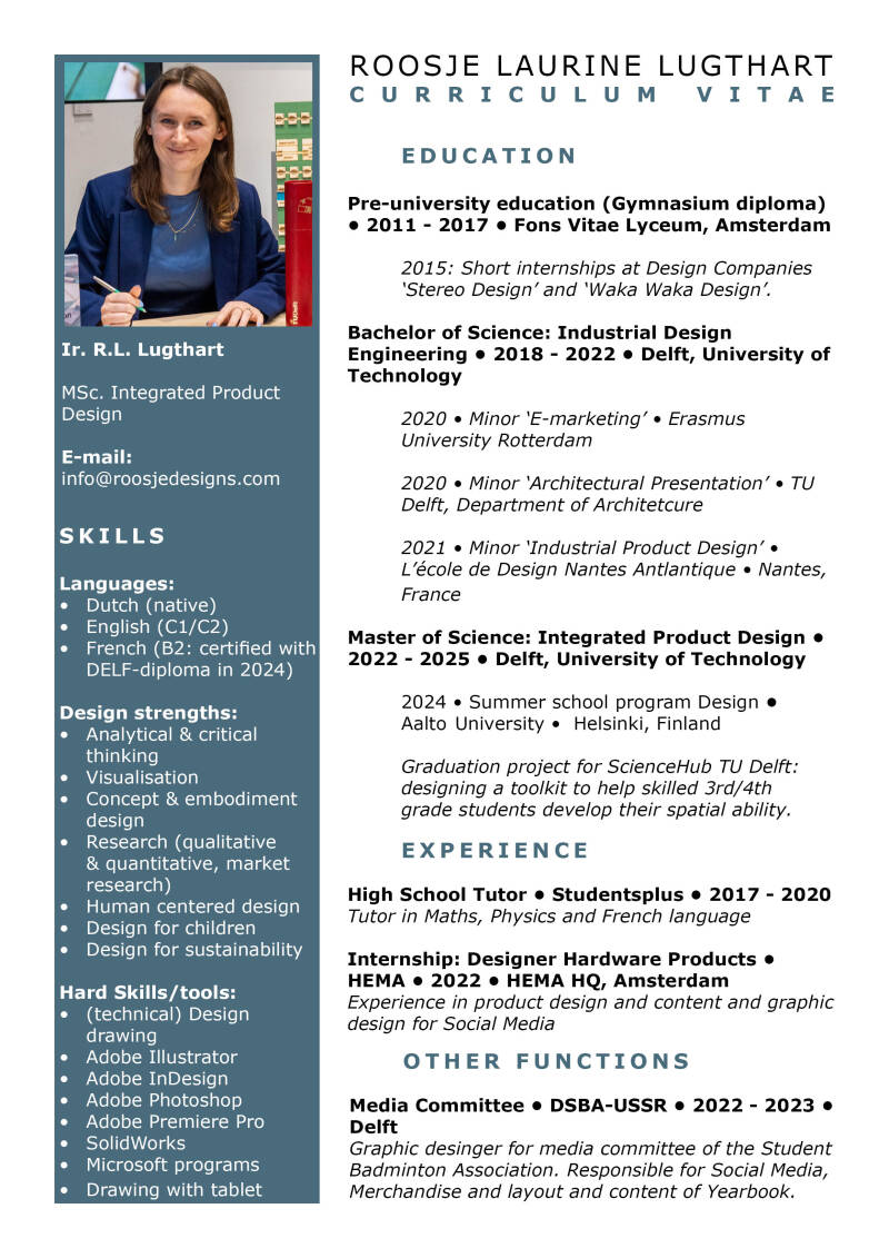 Hi I’m Roosje, an industrial product designer. I started my design career by doing the Bachelors Industrial Design Engineering and I have just finished the Masters Integrated Product Design, both at TU Delft. During this period I also studied abroad in France, where I followed the minor product design at L'école de Design Nantes Antlantique and I did an internship for HEMA design department in Amsterdam. I have learnt a lot about my own interests and strengths within product design and am now excited to pursue my career outside of studying.